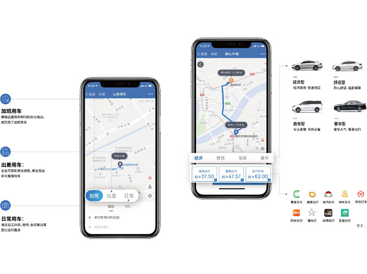 聚合多家网约车车企,满足多场景、多车型需求。运力超2000万,覆盖全国400多个主要城市,满足加班用车、出差用车、日常用车三个场景。企业可通过后台设置用车时间和办公地点,定制审批流程等规范员工各场景用车。