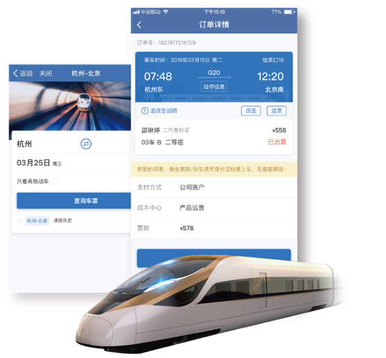 提供火车票预订服务及退改签等多种票务服务,极速出票。员工可凭身份证快速进站,国铁商旅后续可统一提供火车票纸质凭证。