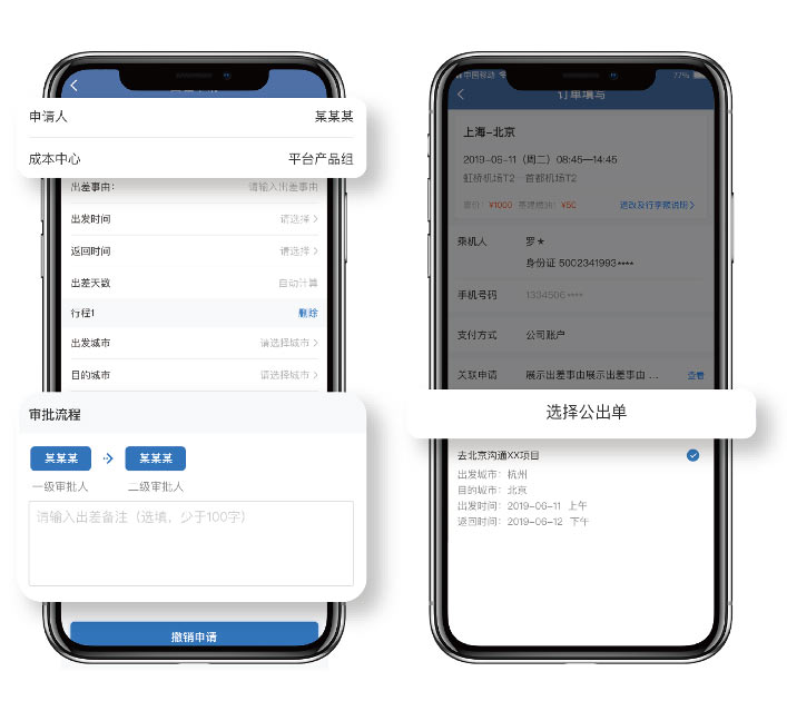 可关联企业管理OA系统,支持企业按照部门或者层级设置审批人,企业管理者可线上审批员工出差申请,事前核对行程、事中出行数 据实时记录、事后信息核实,帮助企业实时管理员工差旅。