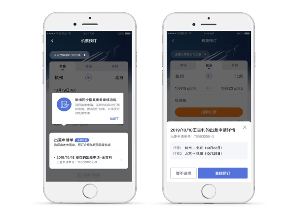 吉利商旅自主研发的系统,可与企业OA系统进行人员/审批等信息流对接,全流程一站式差旅管控同步OA公出单,实现财务OA自动化对接。