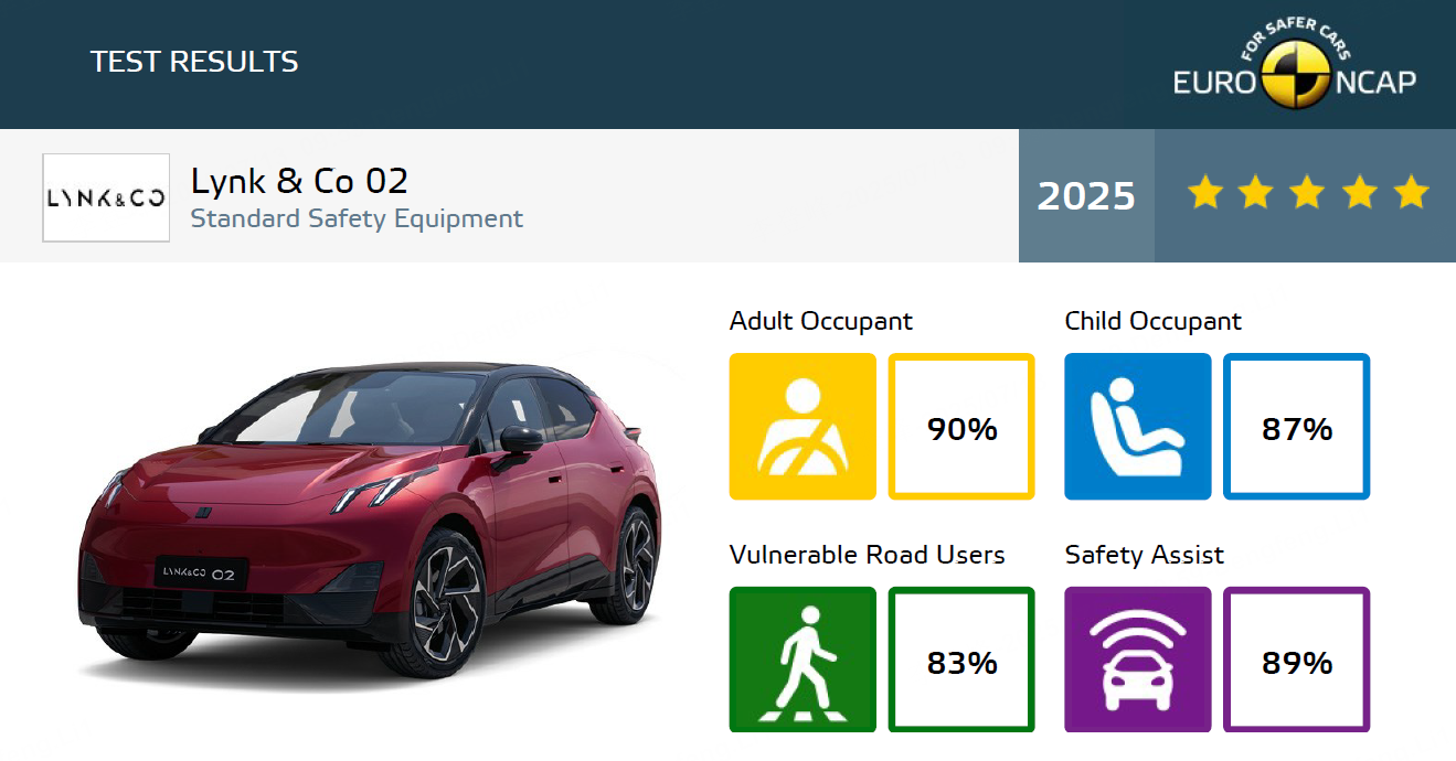 With the conclusion of the latest rounds of tests, the Lynk & Co 02 has been awarded the highest Euro NCAP safety score in the global compact SUV segment in based on the current evaluation cycle. In addition to becoming the safest vehicle in its class tested by Euro NCAP in 2025, the all-electric 02 was recognized for its outstanding performance across all testing categories including Adult Occupant, Child Occupant, Vulnerable Road Users and Safety Assist. The model set a new safety benchmark after achieving the highest ever score for Safety Assistance at 89 points. In Europe, the 02 joins its sibling the 01 plug-in hybrid, both carrying full 5-star ratings.